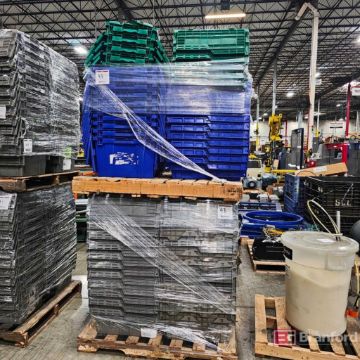 (2) Pallets of Plastic Nesting Storage Bins w/ Integrated Lids; Approx (78) Total [48 Gray, 30 Blue/Green], Approx 22" L x 15" W x 12" H