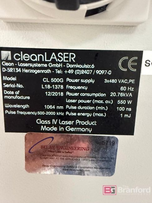 cleanLASER Laser Cleaning System; Model: cleanCELL 2220 CL 500G; S/N L18-1328; Date: 12/2018; Wavelength: 1064nm; Laser Power: 550 W; Includes: Haskris Chiller, Model: LX2-W2-61XX3X; Teka Controller Model: LFE 401, Located: Production 2