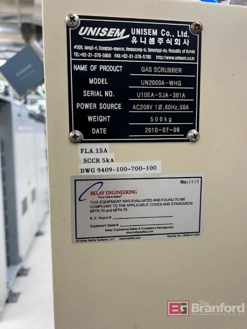 Unisem Gas Scrubber; Model: UN2000A-WHG; S/N U12DA-SJA-361A; Date: 07/2010, Located: Production 2