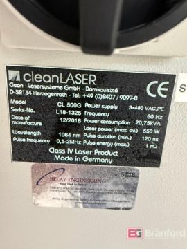cleanLASER Laser Cleaning System; Model: cleanCELL 2220 CL 500G; S/N L18-1325; Date: 12/2018; Wavelength: 1064nm; Laser Power: 550 W; Includes: Haskris Chiller, Model: LX2-W2-61XX3X; Teka Controller Model: LFE 401, Located: Production 2
