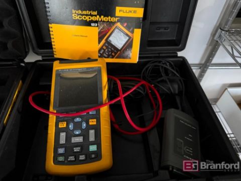 Fluke 123 Industrial Scopemeter and Numerous Calibration Tools. Metro Rack on Casters w/ Contents.