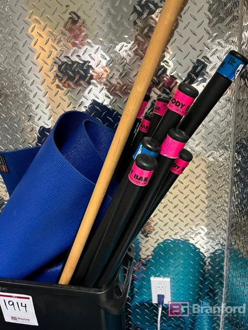 Assortment of (11) body bars, mats, ball, and Lasko Fan, Located: Gym