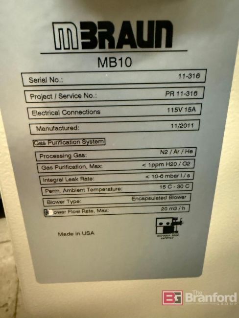 MBRAUN MB10 Gas Purifier; Project No. PR 11-316; S/N 11-316; Year: 2011