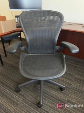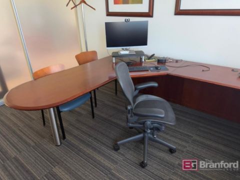 (1) L Shaped Desk. (1) Aeron Chair. (2) Office Credenza's. (2) Assorted Chairs. (2)-HP Monitors. (1) Coat Hanger. (2) Art Pieces, Located: Floor 2