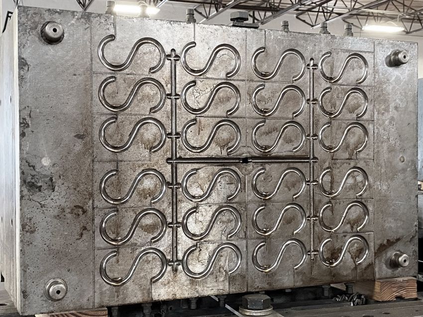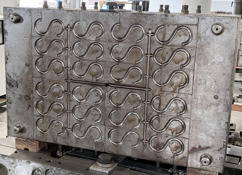 Shower Curtain Hook; Cavities: 24; Mold Dimensions: 29.5" x 18" x 13"; Part Dimensions: 4.25" Long x 2 1/8" Ht; Part Weight: ; Runner: Cold; Weight: 1,800 lbs.; Notes: Solid Design, Made in The USA **Please note- there is an individual Rigging/Banding/Mold Preparation/Loading onto Truck or into Container Fee added to your invoice of $75