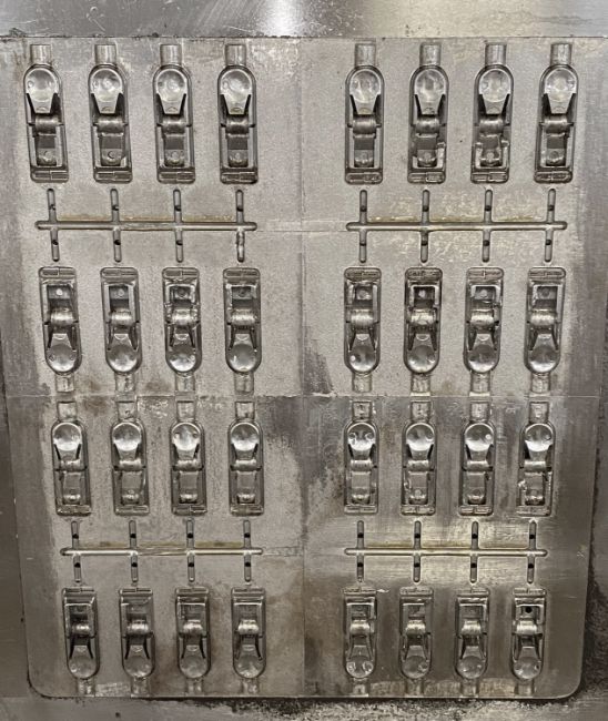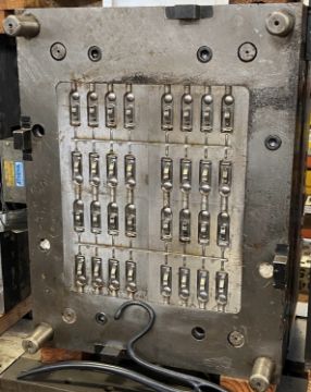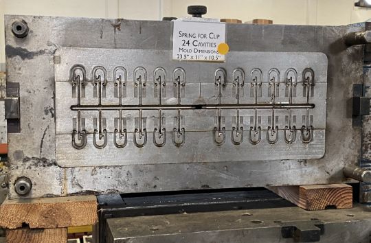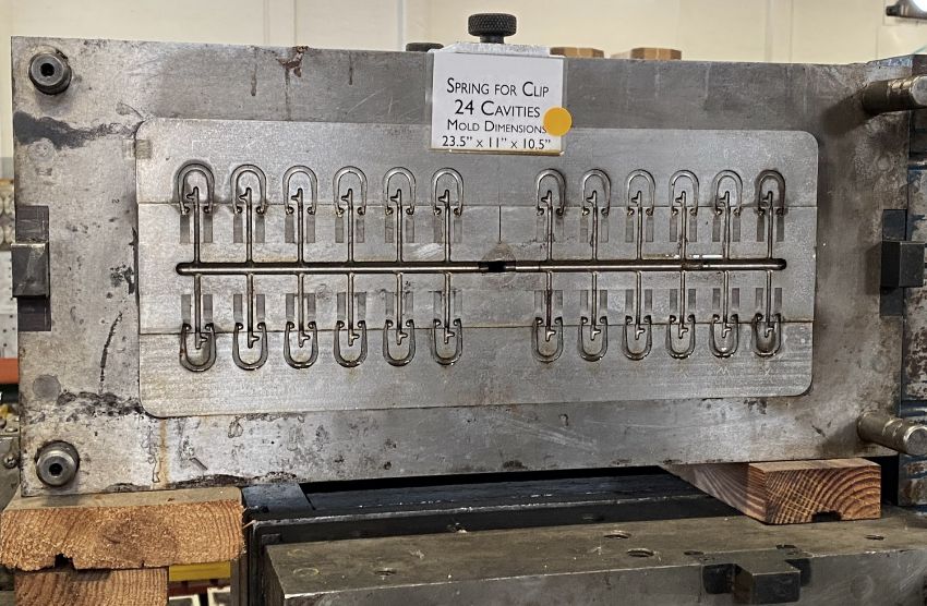 Clip Spring; Cavities: 24; Mold Dimensions: 23.5" x 11" x 10.5"; Part Dimensions: 1 1/8"; Part Weight: ; Runner: Cold; Weight: 700 lbs. / Clothing Clip; Cavities: 32; Mold Dimensions: 23.5" x 18" x 14"; Part Dimensions: 2.25" Long x .75" Wide; Part Weight: 4.7 grams; Runner: Cold; Weight: 1,500 lbs. ; Notes: Clothing Clip designed with Molded Spring, High Production Mold Set, Made in the USA **Please note- there is an individual Rigging/Banding/Mold Preparation/Loading onto Truck or into Container Fee added to your invoice of $125
