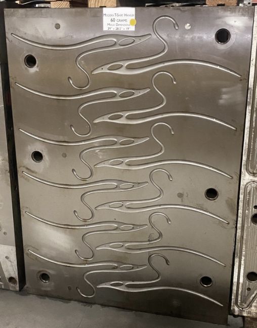 { Choice of lots: 120, 121 } Modern T-Shirt Hanger; Cavities: 12; Mold Dimensions: 39" x 28.5" x 19"; Part Dimensions: 17 1/8"; Part Weight: 60 grams; Runner: Hot; Weight: 5,500 lbs.; Notes: Hi Production 12 Cavity Hot Runner 17" Hanger Mold. Made in USA Like New **Please note- there is an individual Rigging/Banding/Mold Preparation/Loading onto Truck or into Container Fee added to your invoice of $200