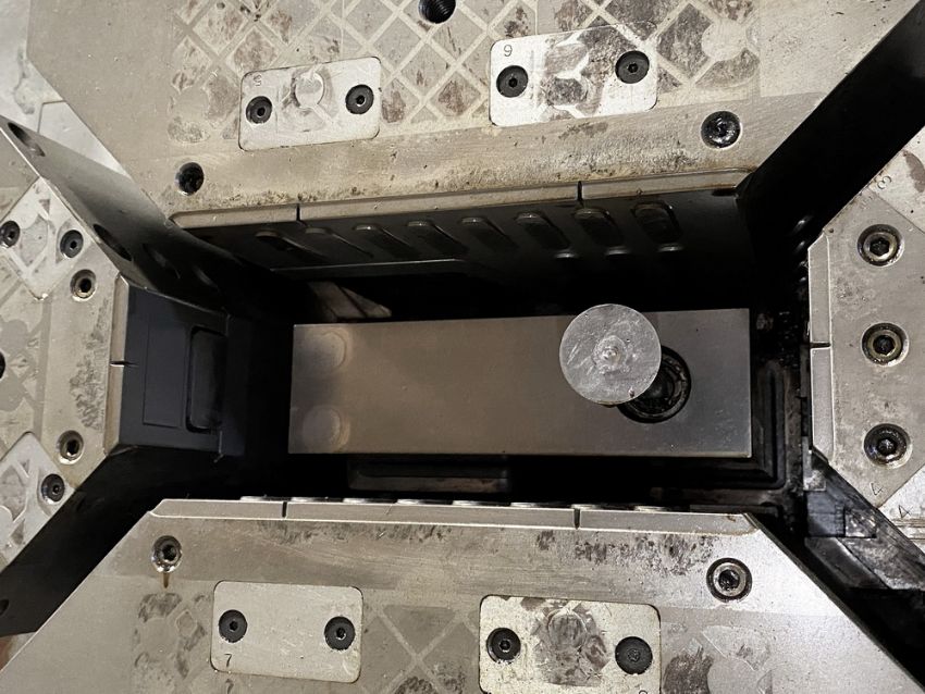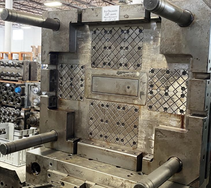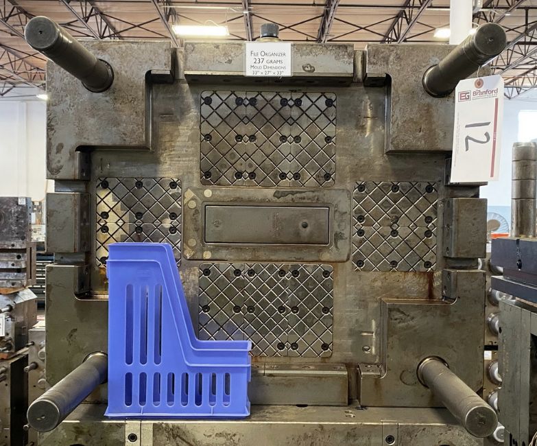Office or Home Use Brochure/Magazine Organizer; Cavities: 1; Mold Dimensions: 33" x 27" x 33"; Part Dimensions: 26 x 9 x 31 cm; Part Weight: 237 grams; Runner: Hot; Weight: 7,500 lbs.; Notes: Mechanical Cores - Fully Automatic Production Mold - Made in USA **Please note- there is an individual Rigging/Banding/Mold Preparation/Loading onto Truck or into Container Fee added to your invoice of $300