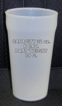 32oz Drink Cup; Cavities: 6; Mold Dimensions: 26" x 18" x 21"; Part Dimensions: 4" Diam x 6.75"; Part Weight: 79 grams; Runner: Hot; Weight: 2,500 lbs.; Notes: Made in The USA **Please note- there is an individual Rigging/Banding/Mold Preparation/Loading onto Truck or into Container Fee added to your invoice of $100