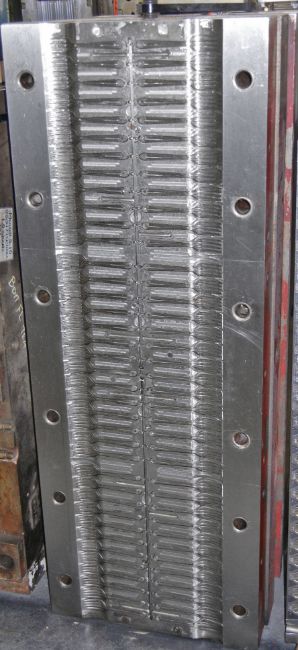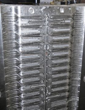 Fork; Cavities: 76; Mold Dimensions: 43" x 16" x 21"; Part Dimensions: 12.8cm; Part Weight: 1.8 grams; Runner: Hot; Weight: 3,700 lbs.; Notes: High Production Mold, Made in The USA, Lightweight Disposable Fork, Items Molded with a Runner Attached **Please note- there is an individual Rigging/Banding/Mold Preparation/Loading onto Truck or into Container Fee added to your invoice of $125