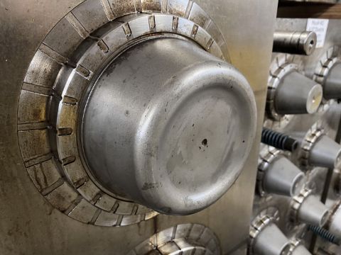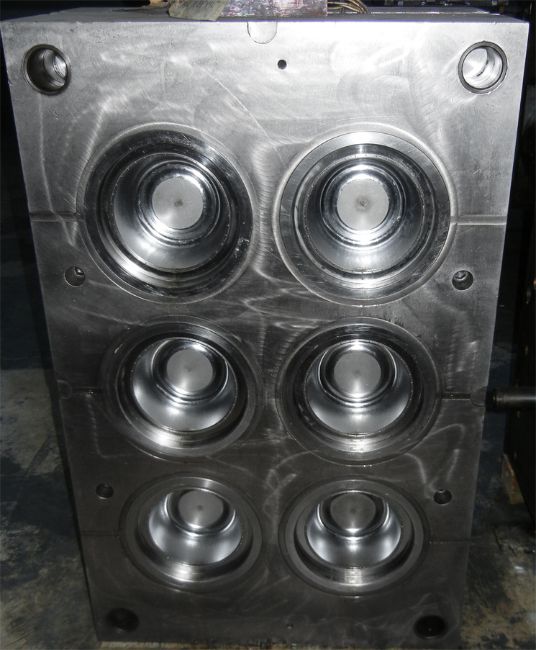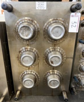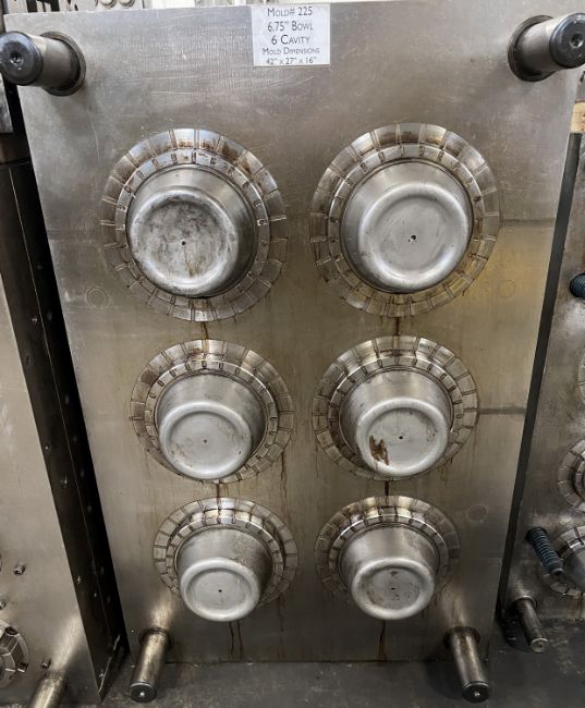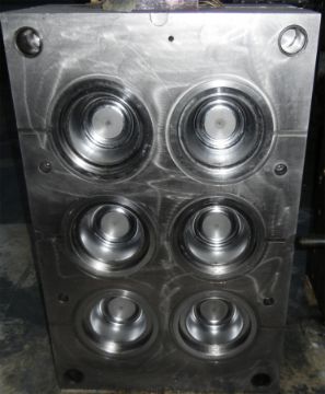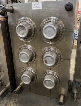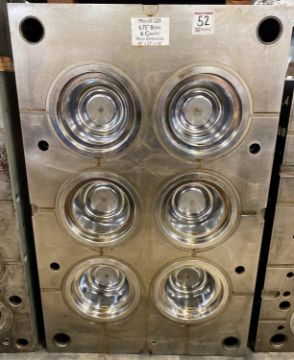 32 oz/1 lt. - 6.75 Diam Container; Cavities: 6; Mold Dimensions: 42" x 27" x 16"; Part Dimensions: 6.75" Diam x 3.25" Ht; Part Weight: N/A; Runner: Hot; Weight: 4,600 lbs.; Notes: Hi Production Mold - Made in USA **Please note- there is an individual Rigging/Banding/Mold Preparation/Loading onto Truck or into Container Fee added to your invoice of $150