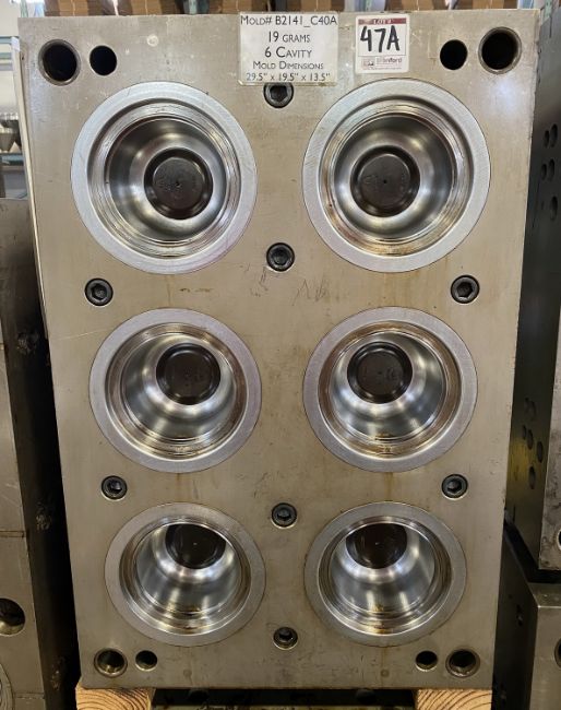 21 oz./621 Ml. Thin Wall Cont.; Cavities: 6; Mold Dimensions: 29.5" x 19.5" x 16"; Part Dimensions: 12.9 Diam x 6.6 cm; Part Weight: 19 grams; Runner: Hot; Weight: 2,400 lbs.; Notes: Hi Production Mold Made in USA **Please note- there is an individual Rigging/Banding/Mold Preparation/Loading onto Truck or into Container Fee added to your invoice of $100, Lid Mold Sold in Lot 47C