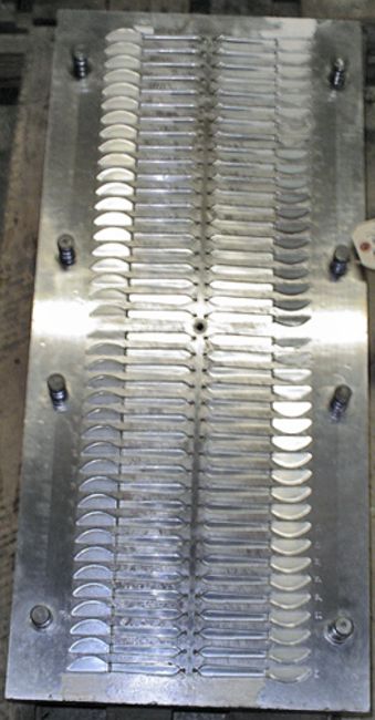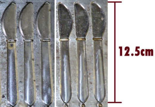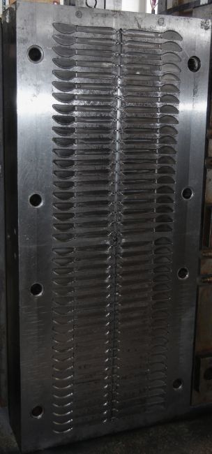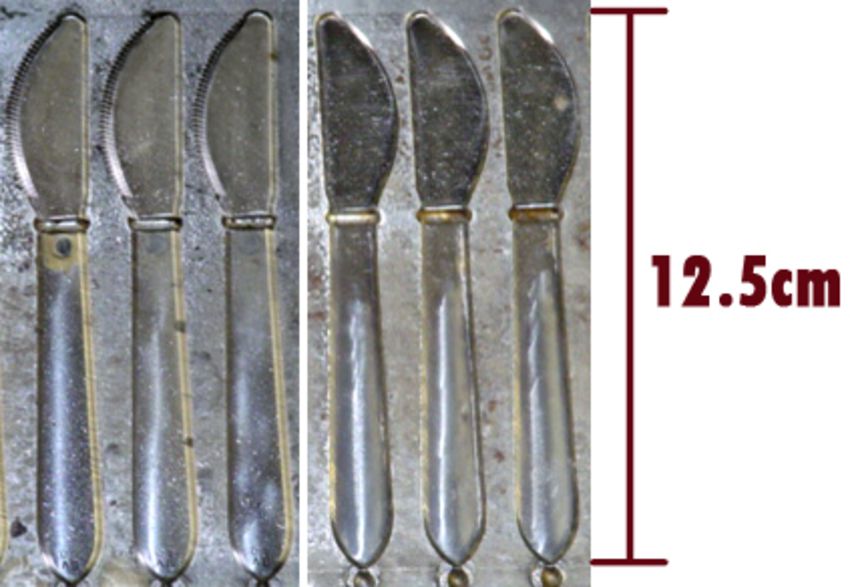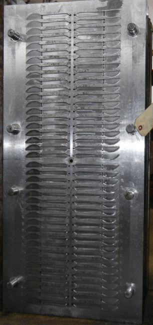 Small Knife; Cavities: 80; Mold Dimensions: 35" x 16" x 13"; Part Dimensions: 12.7 cm; Part Weight: 2.5 grams; Runner: Hot; Weight: 2000 lbs.; Notes: Made in The USA, Small Childrens Knife, Items Molded with a Runner Attached **Please note- there is an individual Rigging/Banding/Mold Preparation/Loading onto Truck or into Container Fee added to your invoice of $100