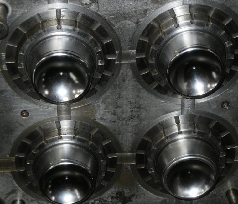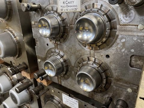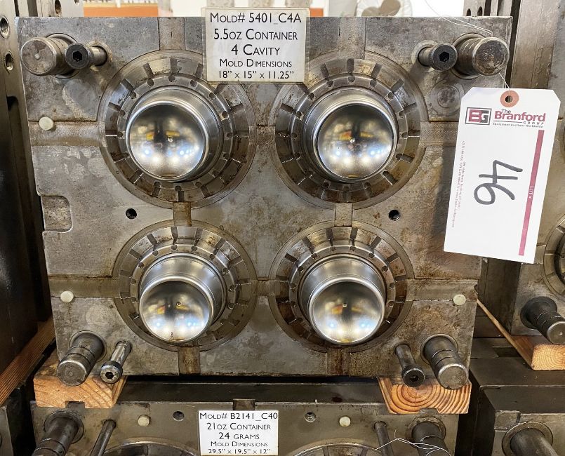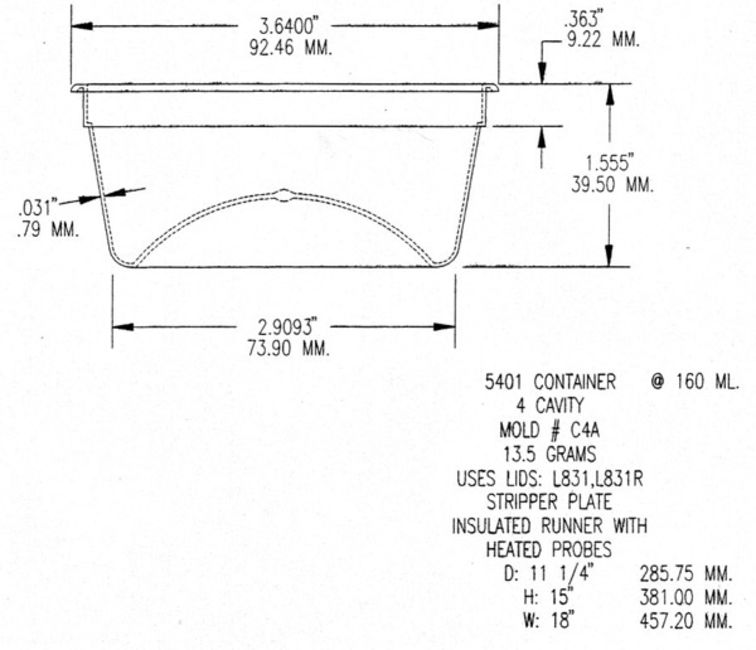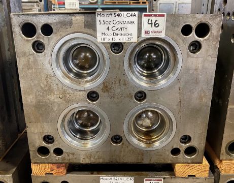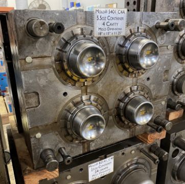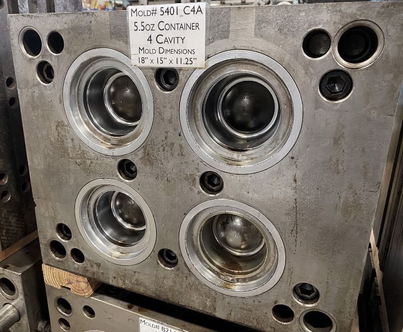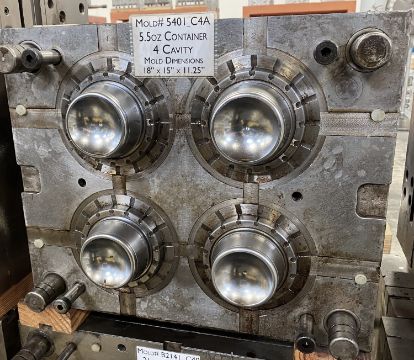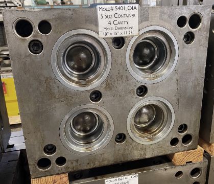 160m / 6 oz. Thin Wall Container; Cavities: 4; Mold Dimensions: 18" x 15" x 11.25"; Part Dimensions: 9.2 Diam. X 3.95 cm; Part Weight: 13.5 grams; Runner: Insulated; Weight: 775 lbs.; Notes: Hi-Production container mold. A1 Quality Tools - Made in USA **Please note- there is an individual Rigging/Banding/Mold Preparation/Loading onto Truck or into Container Fee added to your invoice of $50
