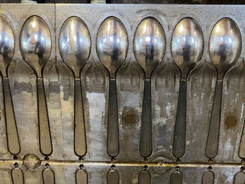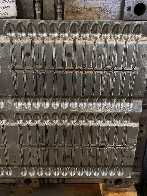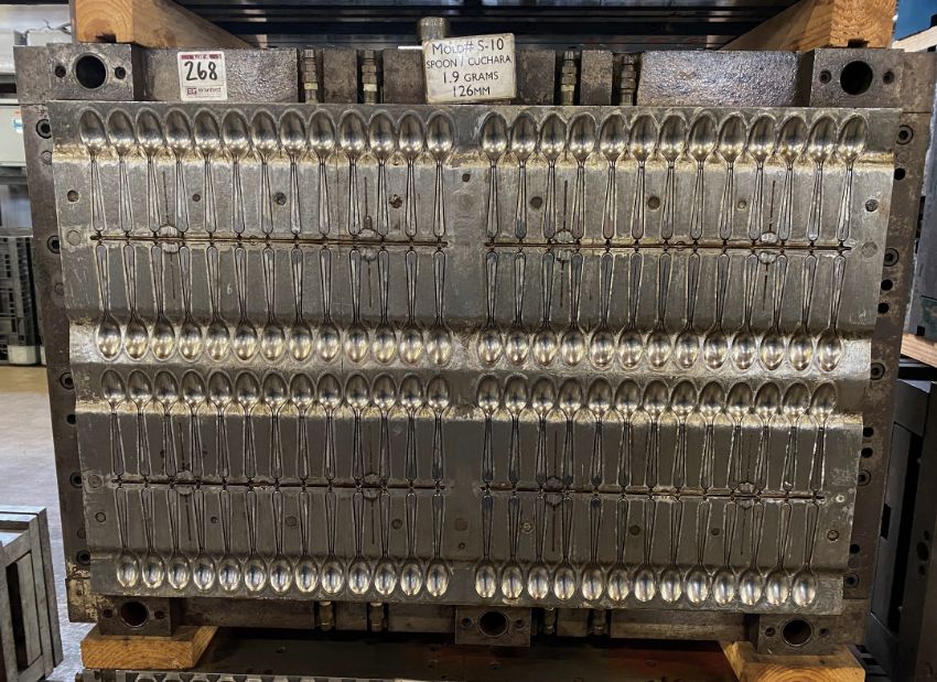 Tea Spoon; Cavities: 104; Mold Dimensions: 39" x 27" x 16"; Part Dimensions: 12.5cm; Part Weight: 1.9 grams; Runner: Hot; Weight: 4,300 lbs.; Notes: High Production Mold, Made in The USA, Lightweight Disposable Teaspoon, Items Molded with a Runner Attached **Please note- there is an individual Rigging/Banding/Mold Preparation/Loading onto Truck or into Container Fee added to your invoice of $150