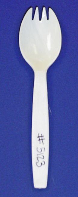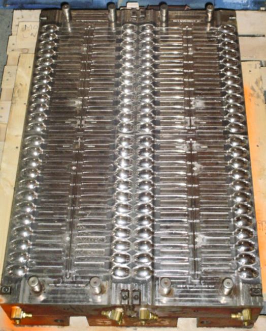 Spork; Cavities: 96; Mold Dimensions: 37" x 24" x 20"; Part Dimensions: 12.8 cm; Part Weight: 3 grams; Runner: Hot; Weight: 4,500 lbs.; Notes: High Production Mold, Made in The USA, Lightweight Disposable Spork, Hot Runner Manifold, Items Molded with a Runner Attached **Please note- there is an individual Rigging/Banding/Mold Preparation/Loading onto Truck or into Container Fee added to your invoice of $150