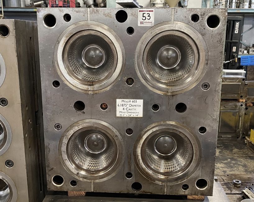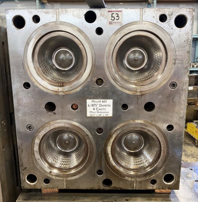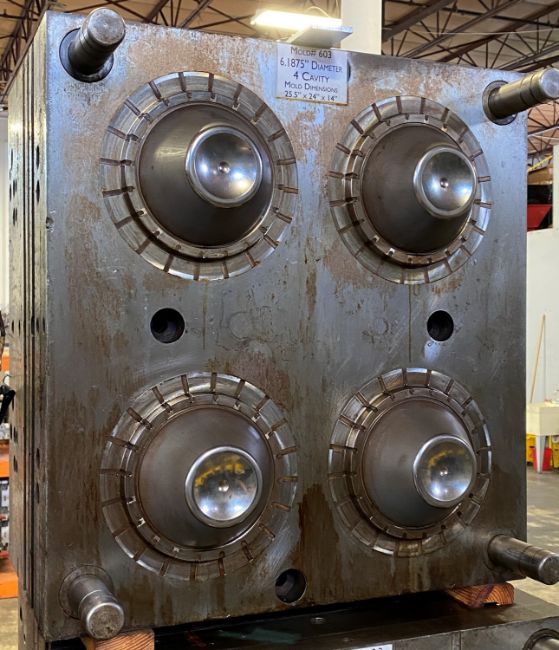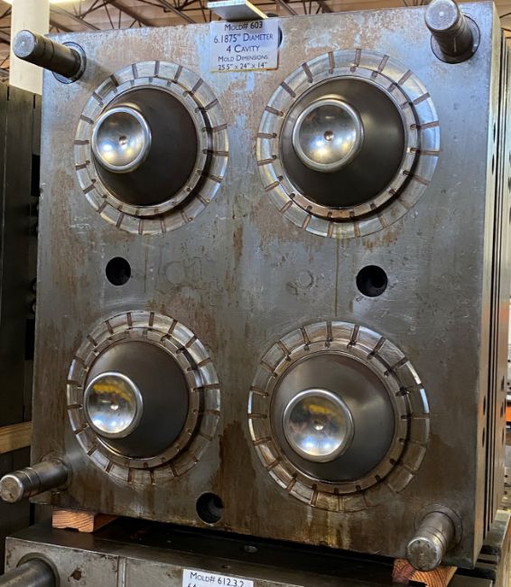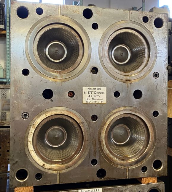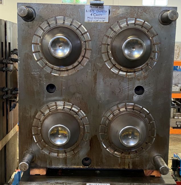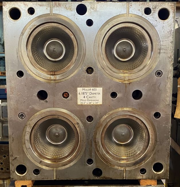 14 OZ Decorative Diamond Cut - Thin Wall Container ; Cavities: 4; Mold Dimensions: 25.5" x 24" x 14"; Part Dimensions: 6.25" Diam x 2.75" Ht; Part Weight: N/A; Runner: Hot; Weight: 2,200 lbs.; Notes: Diamond Cut Etching thin wall Container - Uses 602 lid Top Grade Mold - Made in USA **Please note- there is an individual Rigging/Banding/Mold Preparation/Loading onto Truck or into Container Fee added to your invoice of $100