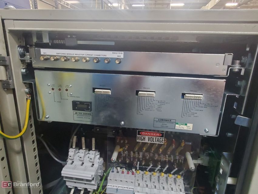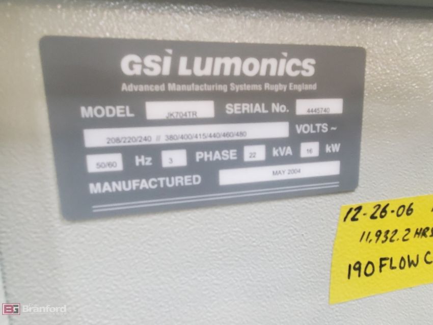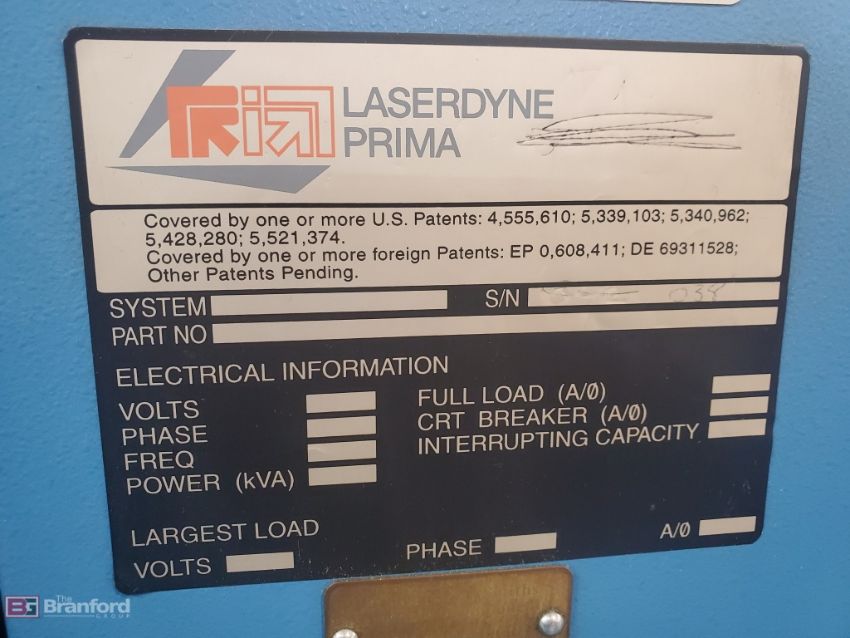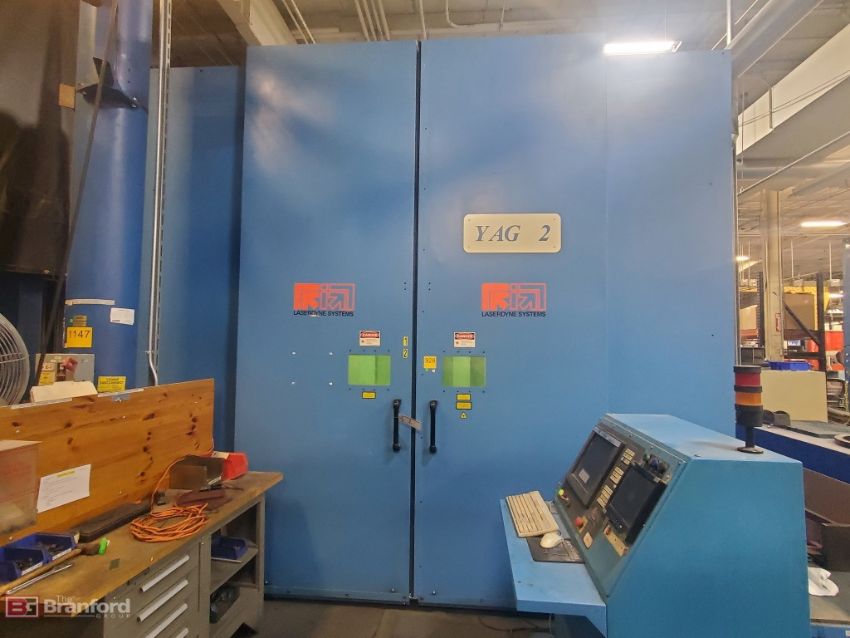 2004 PrimaPower Laserdyne 3D 5-Axis YAG Drilling/Cutting/Welding Laser System, w/ GSI Lumonics JK704 Laser, BeamDirector Laser Contouring Head (S/N 123), System 94W Laser Computer, Teach Pendant Controllers, Control Cabinet, Approx. 148" Tall x 160" Wide, x 102" Deep Enclosure, 2004 GSI Lumonics Power Source w/ JK704TR Microprocessor, Controller Cabinet, 6,418.7-Hours; Note: Steel Work Table and Green Matsumoto Rotary Table Not Included, Located at 967 Parker St Facility