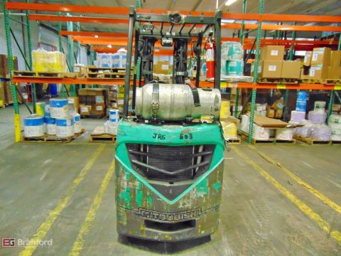 Mitsubishi model FGC15N 5000-lb cap. LP forklift, w/ side shift, 6 degree tilt back, triple stage mast, solid pneumatic tires, s/n AF81F41612, attachment # SSH032C151, 8833.9-hours