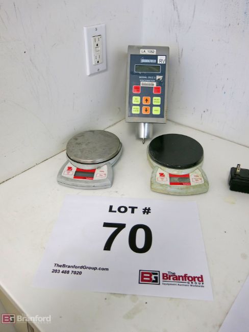Brookfield model BV-II plus viscometer, (2) Ohaus 5000g. digital scales