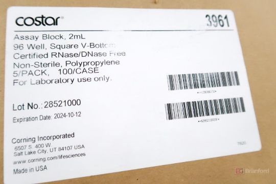 (2) Pallets of Approx. (38) Corning Costar Assay Block, 2mL, 96 Well, Square V-Bottom, Non-Sterile, Polypropylene, Lot No. 21721000 New Cost Per Case: $318.04