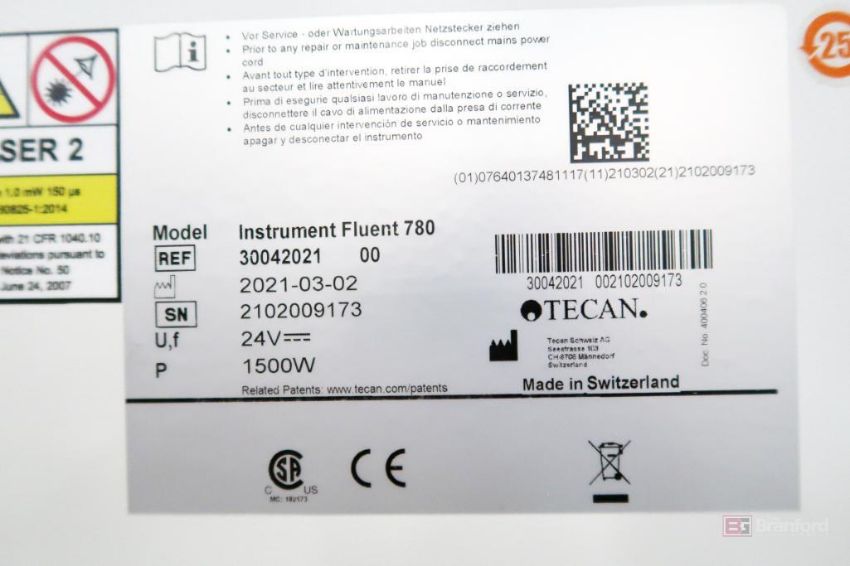 Tecan Instrument Fluent 780 Automatic Liquid Handler, REF # 30042021 (2021), S/N 2102009173, 24V, 1500W