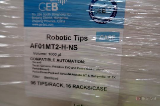 (2) Pallets of GEB AF01MT2-H-NS Robotic Tips, Filtered, Sterilized, Volume: 1000ul, Various Number of Cases per Pallet - Please See Photos