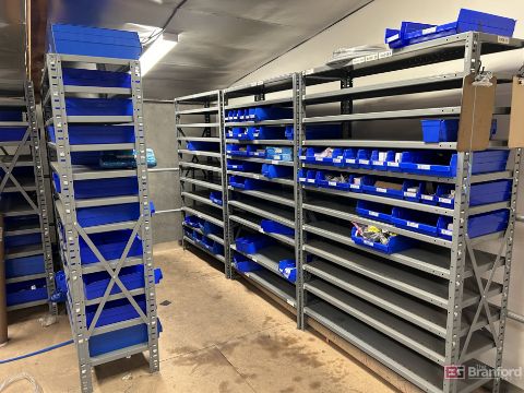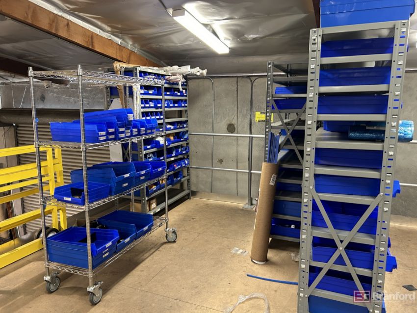 Lot consisting of all contents of upstairs mezzanine including approximately (14) Adjustable Industrial Storage Racks with contents; Blue Totes; (10+) Spare Motors, several never installed