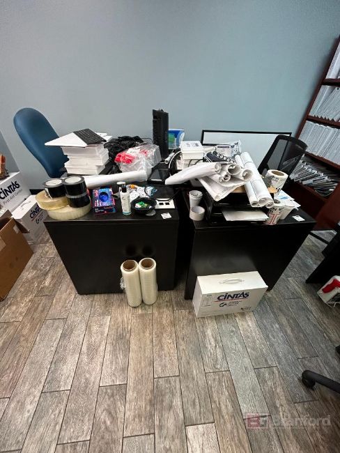 Lot consisting of Office Contents; (4) Wood Laminate Rectangle Desks, (1) Wood Laminate L Shaped Desk, File Cabinet, (1) HP Color LaserJet Pro Printer M454dn; (1) HP PageWide Pro MFP 577dw Printer