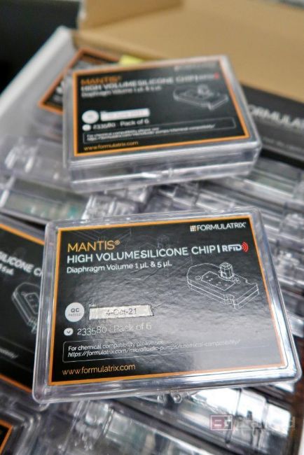 Lot of Formulatrix Mantis Supplies and Parts; Including But Not Limited To: (4) Boxes of Mantis High Volume Silicone Chips, Mult. Boxes of Mantis Continuous Flow Chips, Spare Plate Adapters, Cords, Tubes and Caps