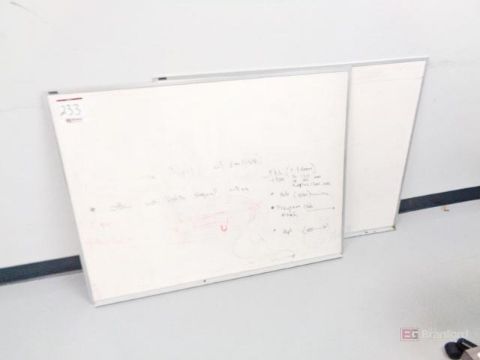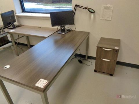 Lot of (2) 6' Writing Desks, 4' Table, (2) Dell Monitors, (2) Rolling Filing Cabinets, (2) Quartet Whiteboards