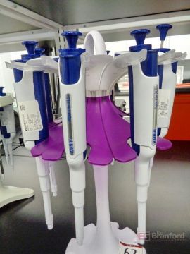 (8) Rainin Pipet-Lite XLS Single-Channel Pipettes w/ Stand, (4) L-1000, (2) L-200, (1) L-100, (1) L-10