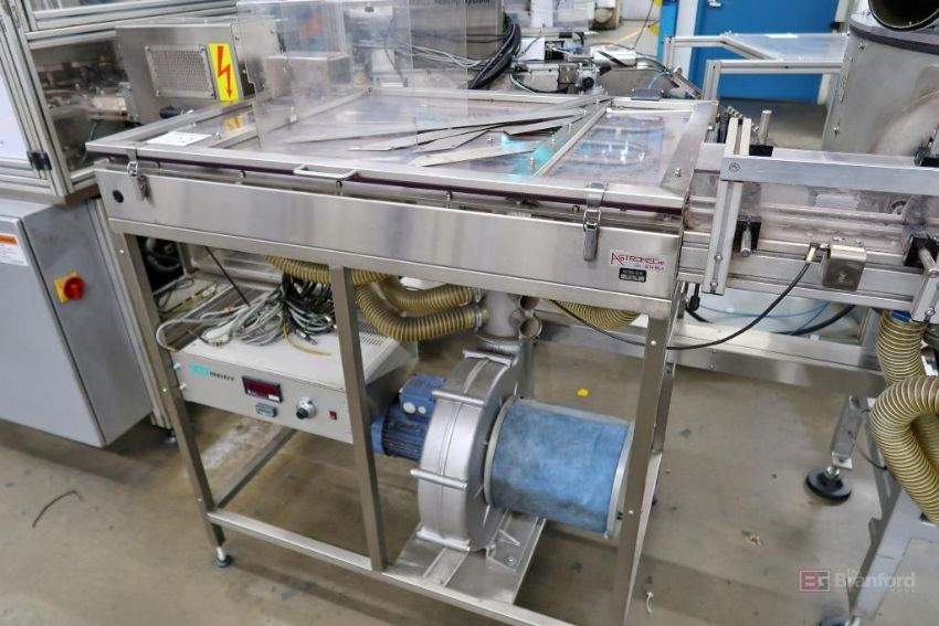 Plastic Bottle Cap Finishing System, Including: Incline Cooling Conveyor, PSG PackSys Global SFG 2 Cap Hopper/Elevator, PSG PackSys Global JetStream RF1-H Sorter, Astromecag CH-3074 Muri Serpentine Accumulator Conveyor, IMD Vista Electrode EFK12 Spark Tester, PSG MSM 5-FSH Folder/Slitter, IMD CapMaster Closure Testing System, PTSE Material Blower H100/2 G1G