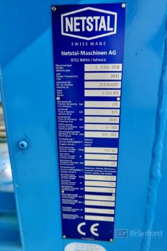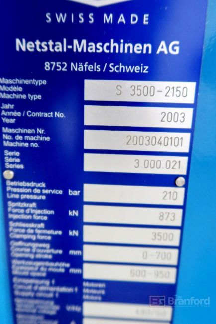 Netstal S 3500-2150 Synergy 395-ton x 42-oz Injection Mold Machine, Tie Bar Spacing 28.35" x 28.35" Min/Max Mold Height 23.62" x 37.40", Open Stroke 27.56", 70mm Screw Diameter, (2003), S/N 2003040101, 137,428-Hours Reported, Weight 25,100-kg