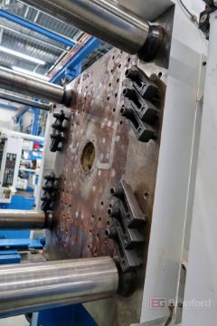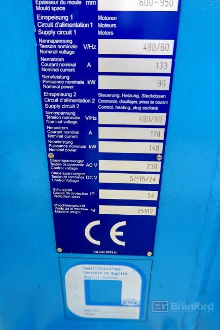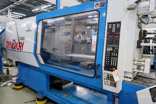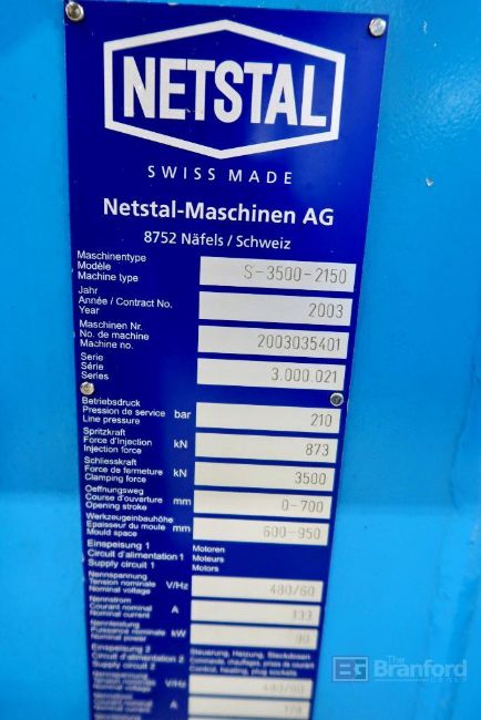 Netstal S 3500-2150 Synergy 395-ton x 42-oz Injection Mold Machine, Tie Bar Spacing 28.35" x 28.35" Min/Max Mold Height 23.62" x 37.40", Open Stroke 27.56", 70mm Screw Diameter, (2003), S/N 2003035401, 139,609-Hours Reported, Weight 25,100-kg