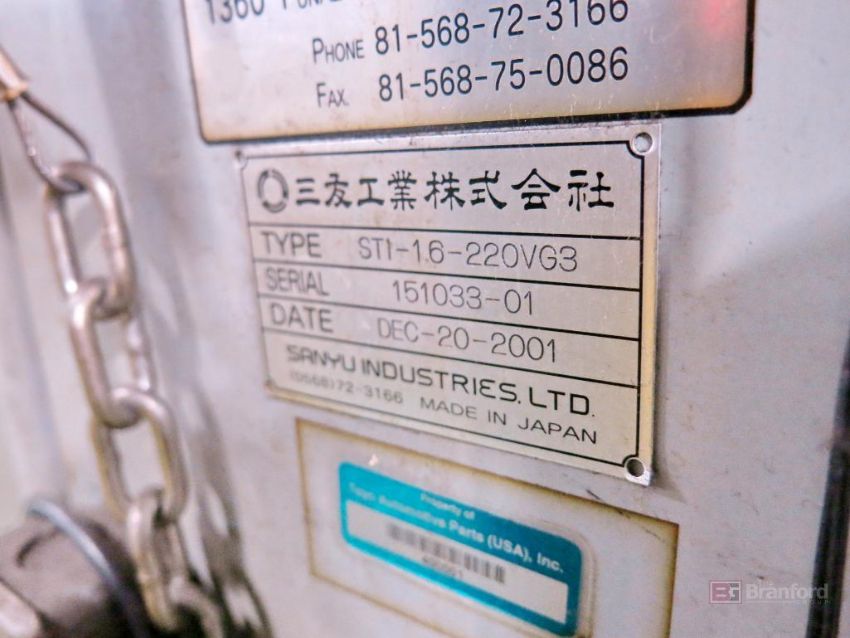 { Choice of lots: 101, 102, 103, 104, 105, 106, 107, 108, 109 } Sanyu 1.6L Vertical Rubber Injection Molding Machine Model STI-1.6-220VG3, S/N 151033-01, 2001