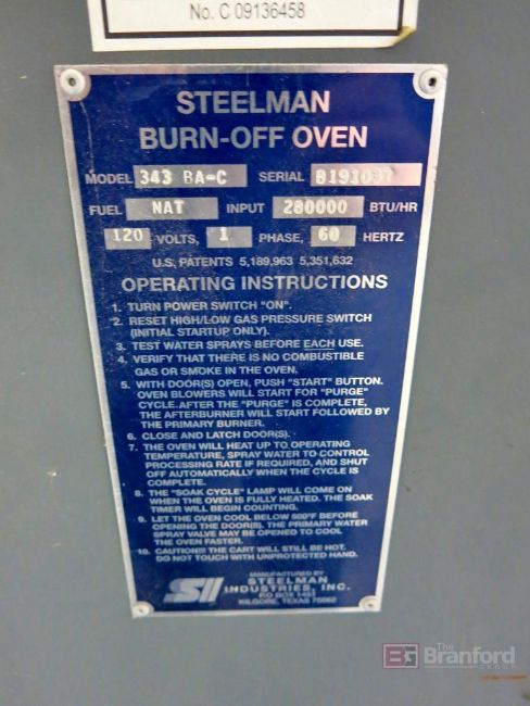 Steelman Burnoff Oven Model 343 BAC, Pre Burner Max. Temp. 800°, Post Burner Temp. Approx. 900°, w/ Track Entrance, Cart, (3) Racks, S/N B191037