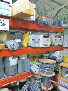 Section of Pallet Racking w/ Contents Incl Spools of Wire, Metering Pumps, Filters, Conveyor Belts, Conduit, Tubing