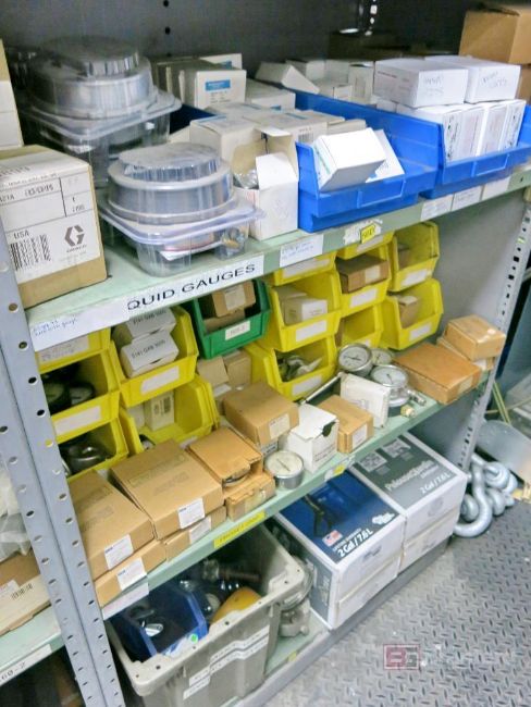 (6) Sections of Racking w/ Contents Incl But Not Limited To: Pressure Gauges, Filters, Electric Drivers, Chain, PVC Connectors, Air Filters, Pressure Cylinders, Heat Exchanger Plates, Numerous Other Related Spare Parts Please Inspect