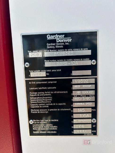 Gardner Denver Model: L55RS-10A Variable Speed Rotary Screw Compressor; 75 HP, Date: 2016; S/N S498325