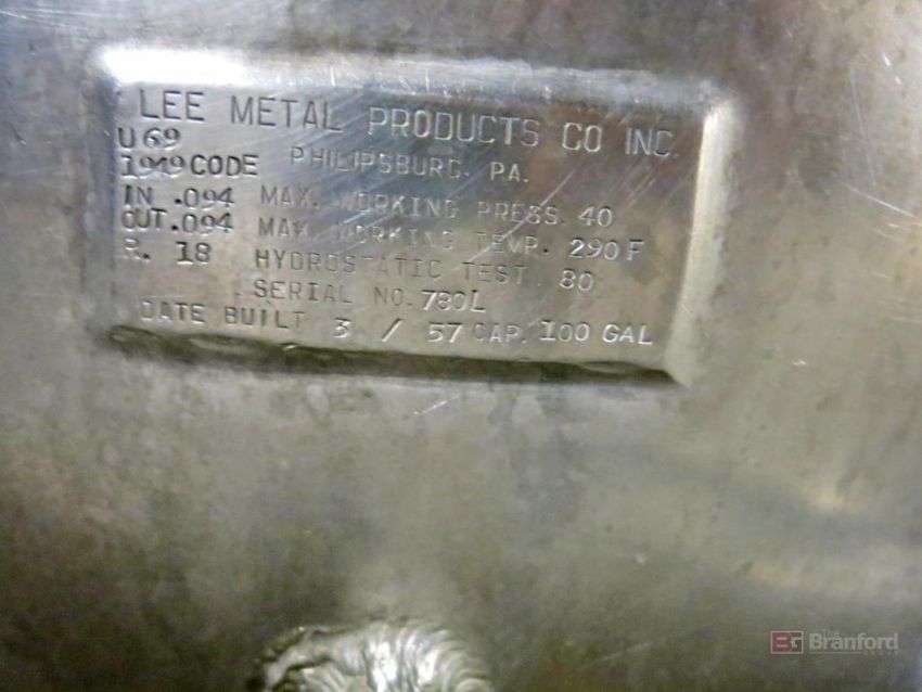 Lee Metal Products Model U69 Stainless Steel Steam Jacketed Kettle 35 PSIG, 100-Gallon