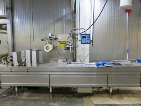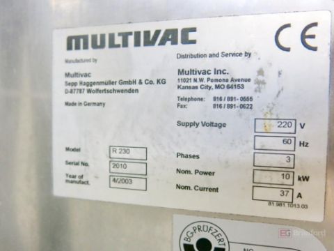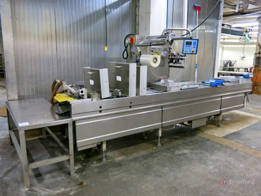 Multivac Model R230 Rollstock Packaging Machine, S/N 2010, w/ Multivac Digital Controls & Display, 2010; Overhead Racking System, Lower Tray Conveyor