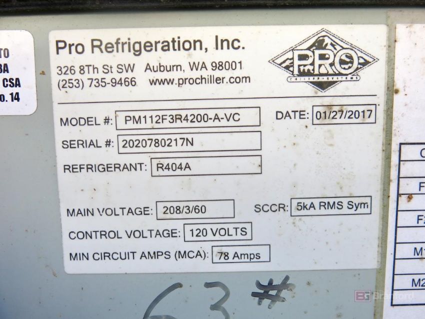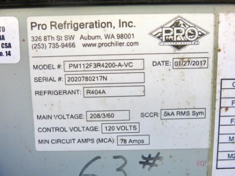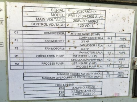 Pro Chillers Model PM112F3R4200-A-VC, Type of Refrigerant R404A, Compressor Model MPZ160HW3VE, 12-HP; Circulation Pump 1-HP, Process Pump 3-HP, S/N 2020780217N, (2017)