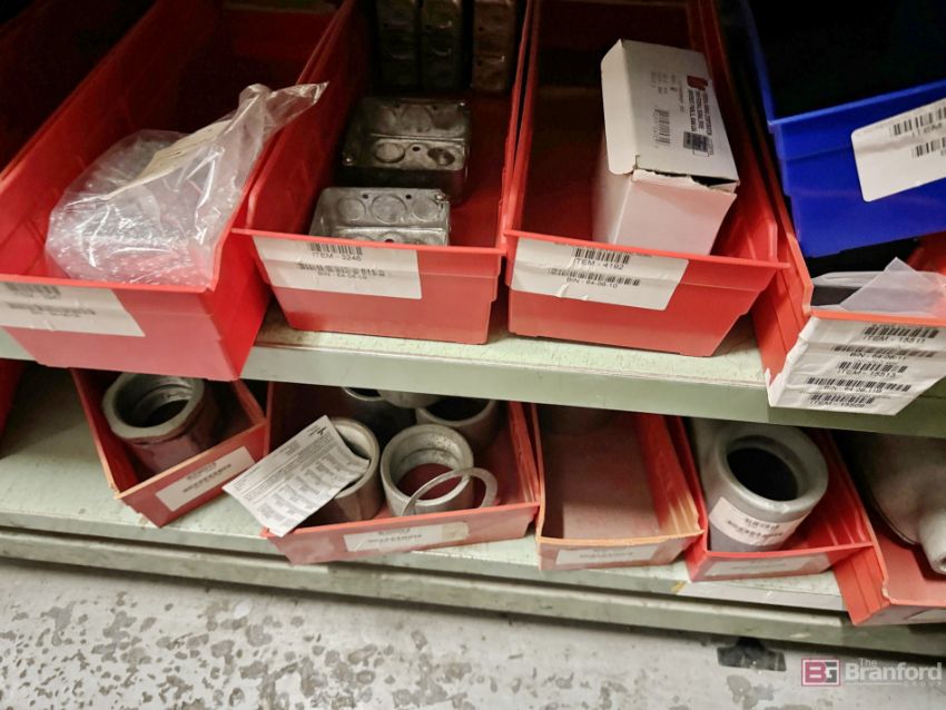 Shelving unit and contents including: Large Lot of Fuses, Time Delay Fuses, Super Lag Buss, Electrical Conduit, Metal Boxes, Outlets, Threaded Junctions - Please inspect for details ***Please Note - A fee of $400 will be charged for this lot to package and load.