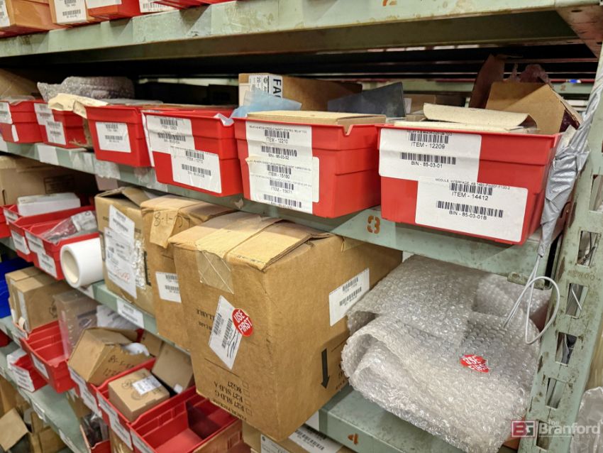 Shelving unit and contents including: ABB Relays, Plug Control, HighSpeed Counter, Fuses, Metering Units, V-Groove Track, Warner Brake - Please inspect for details ***Please Note - A fee of $400 will be charged for this lot to package and load.