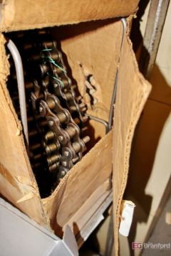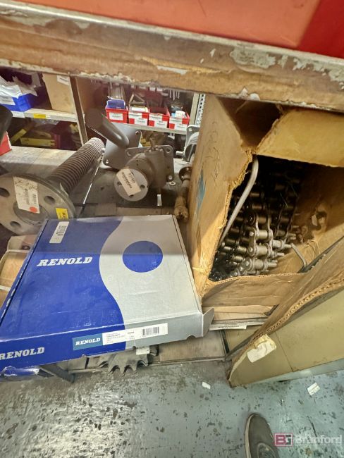 Shelving unit and contents including: Roller Chains - Renold, Hyd Vickers, Steel Sprockets, Various Brass Fittings, Screws, Nuts, Duff Gear Jacks, Parts, Duff Worm Gear Parts - Please inspect for details ***Please Note - A fee of $400 will be charged for this lot to package and load.