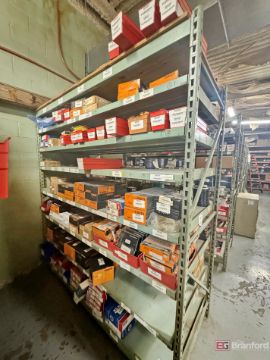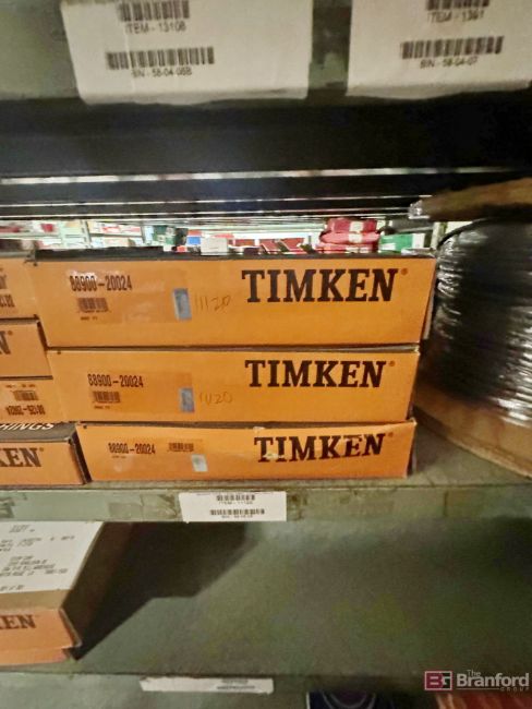 Shelving unit and contents including: large quantity of Timken, SKF, NTN Bower, INA Bearings, Roll of Copper Wire, FAG, NSK Bearings - Please inspect for details ***Please Note - A fee of $400 will be charged for this lot to package and load.