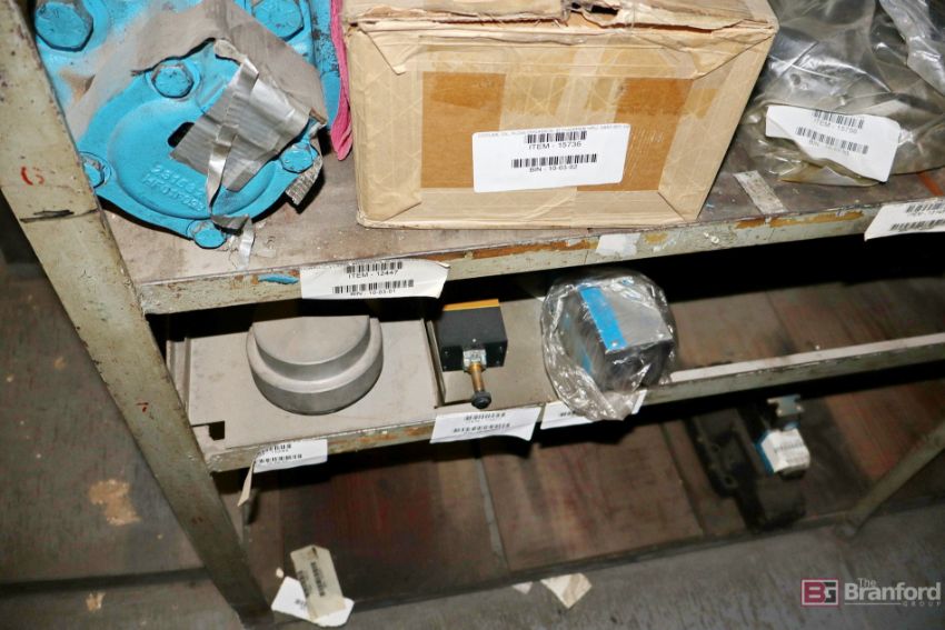 Shelving unit and contents including: Tie Rod Aventics, Grinding Wheels, Oil Filters, Flow Valves, Rexroth Motor 1.2-HP, Springs, Crane Parts - Please inspect for details ***Please Note - A fee of $400 will be charged for this lot to package and load.