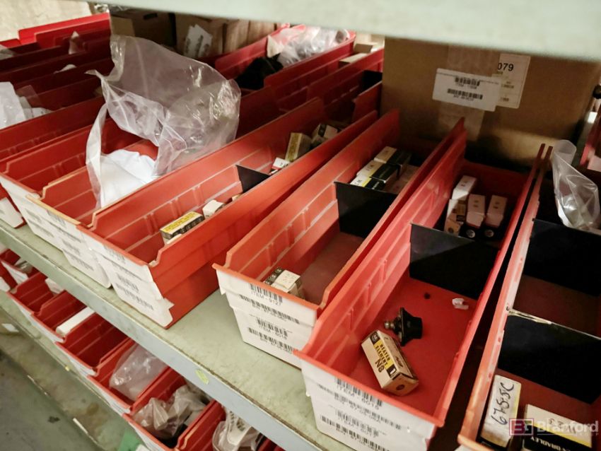 Shelving unit and contents including: Mettler Toledo readouts, Heater Elements, Limit Switches, Contact & Battery Controls, Scale Boxes, Valves, Switches - Please inspect for details ***Please Note - A fee of $400 will be charged for this lot to package and load.