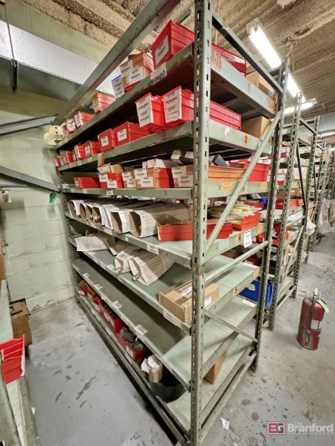 Shelving unit and contents including: transformers, Allen Bradley cables and modules, lightbulbs, Bushings, Rexroth and Siemens components, power supplies, output cards, etc - Please inspect for details ***Please Note - A fee of $400 will be charged for this lot to package and load.